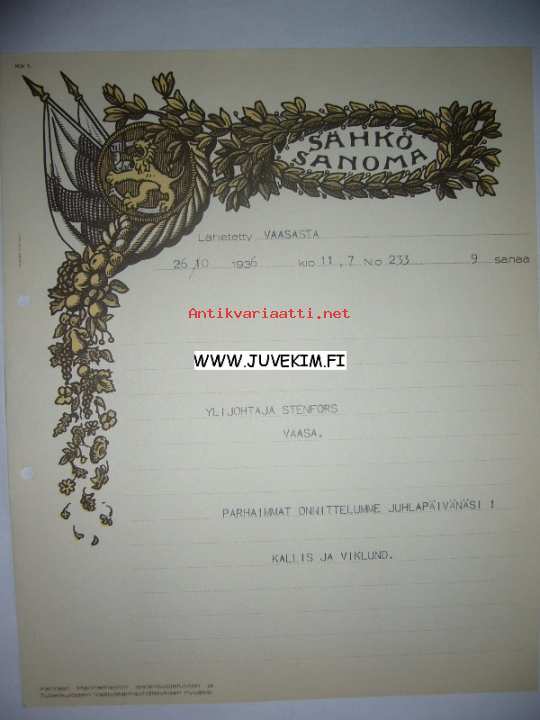 Ylijohtaja Stenfors Vaasa 26.10.1936 -sähkösanoma