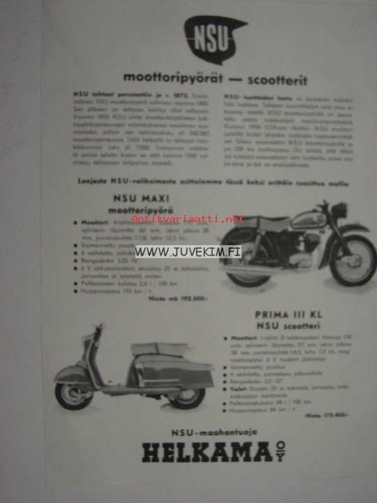 NSU moottoripyörä ja skootteri Maxi, Prima III KL -myyntiesite