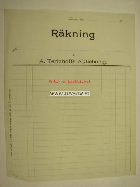 A. Terichoff´s Aktiebolag Loviisa -asiakirja = tyhjä laskulomake ruotsiksi tekstinä vain RÄKNING ja yrityksen yhteystiedot