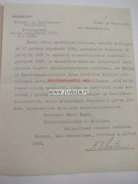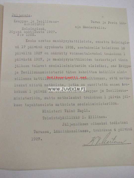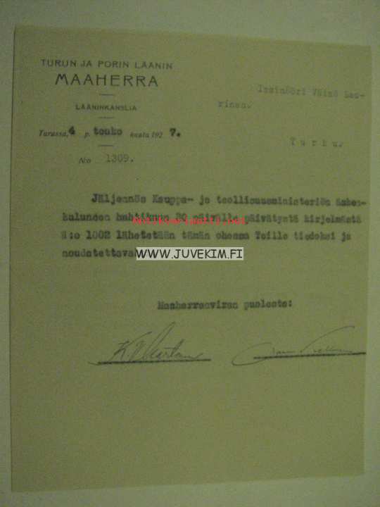 Turun ja Porin Läänin Maaherra -tiedonanto Väinö Lauriselle
