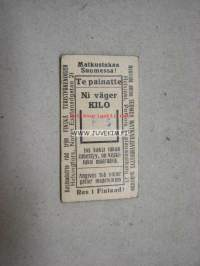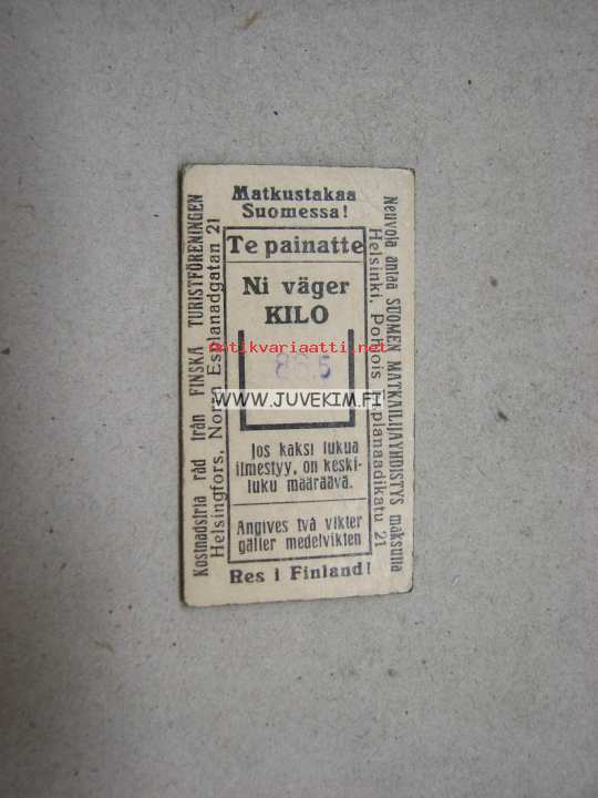 | Saatavilla | 1 kpl | | Julkaisuvuosi | 19?? | | Sivuja | 1 | | Kunto | K3 | | Kielet | Suomi |