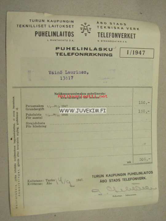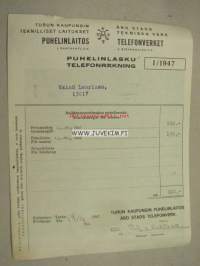 Turun Kaupungin Teknilliset laitokset Puhelinlaitos -puhelinlasku 1947
