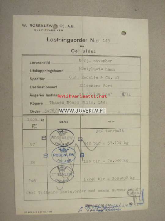 W. Rosenlew & Co Ab Lastningsorder nr 149 1951