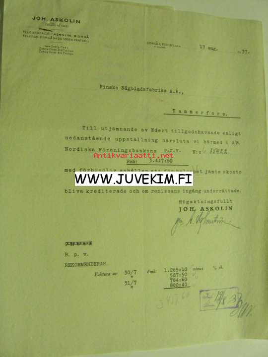 Joh. Askolin, Porvoo 17.8.1937 -asiakirja