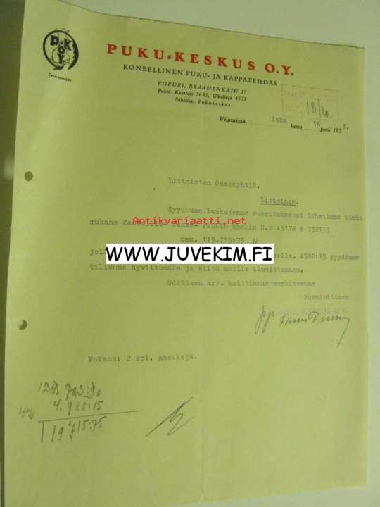 Puku-Keskus O.Y, Viipuri 16.10.1933 -asiakirja