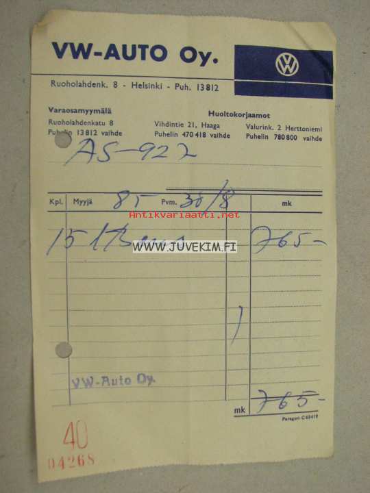 VW-Auto Oy Helsinki 195? -kuitti