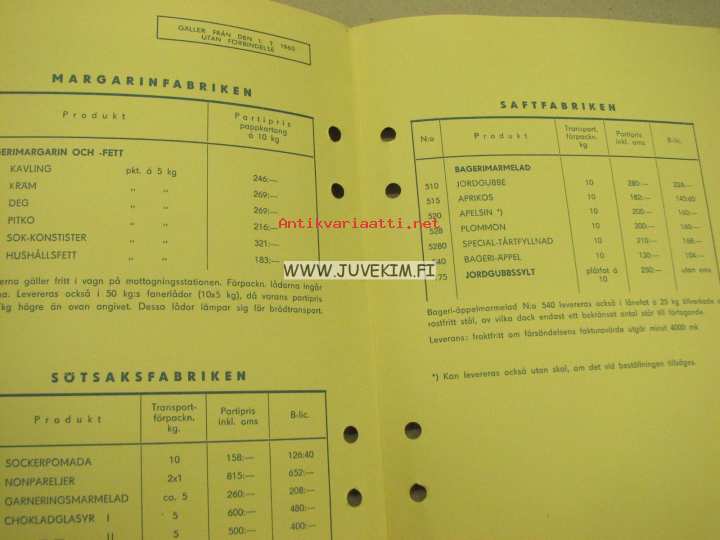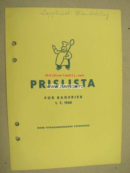 Prislista för bagerier 1.7.1960 SOK Vaajakosken Tehtaat