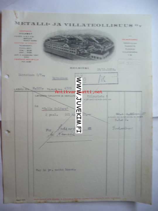 Metalli - ja villateollisuus O/Y Helsingfors 28.11.1939 -asiakirja