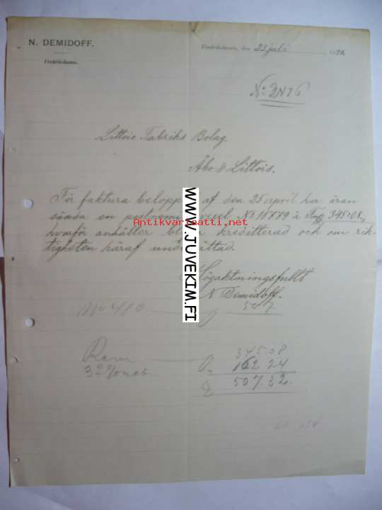 N. Demidoff. Fredrikshamn 23.7.1890 -asiakirja