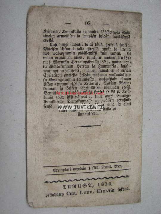 | Saatavilla | 1 kpl | | Julkaisuvuosi | 1830 | | Sivuja | 16 | | Kunto | K2 | | Kielet | Suomi |