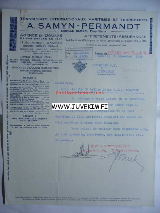A. Samyn -Permandt Anvers 9.12.1939 -asiakirja