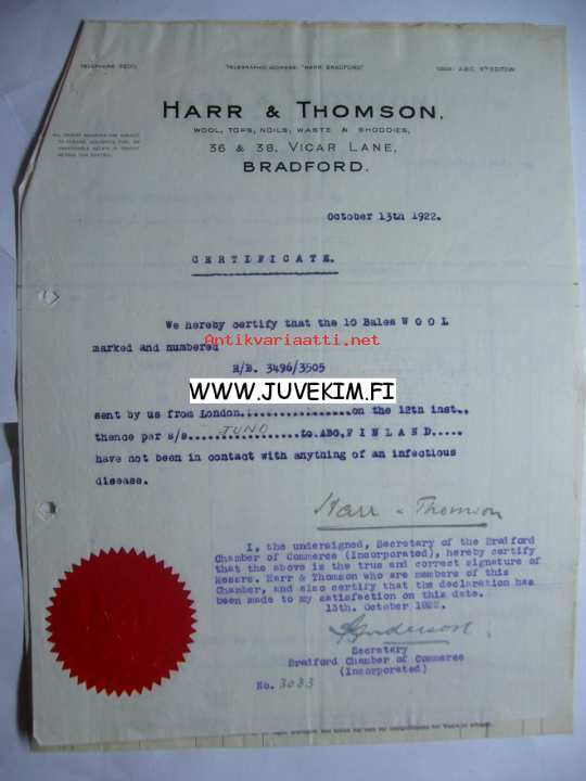 Harr & Thomson Bradford 13.10.1922 -asiakirja