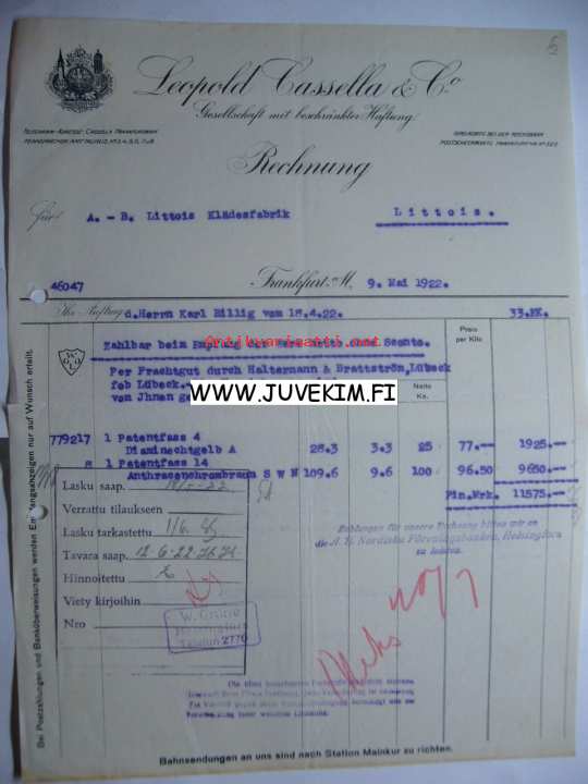 Leopold Cassella & Co Frankfurt 9.5.1922 -asiakirja
