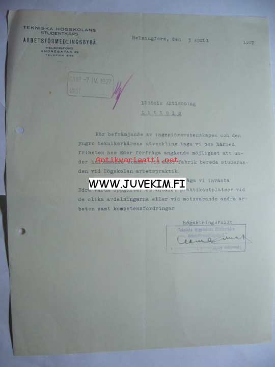 Tekniska Högskolans Studentkårs Arbetsförmedlingsbyrå Helsingfors 5.4.1927 -asiakirja