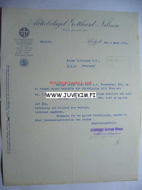 Aktiebolaget Gotthard Nilsson Ålmhult 6.3.1939 -asiakirja