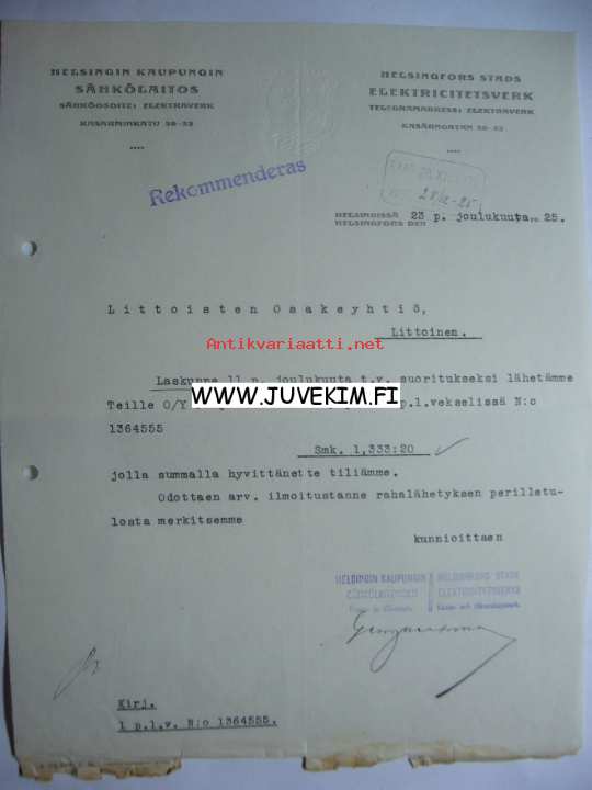 Helsingin kaupungin sähkölaitos Helsingfors /Helsinki 23.12.1925 -asiakirja