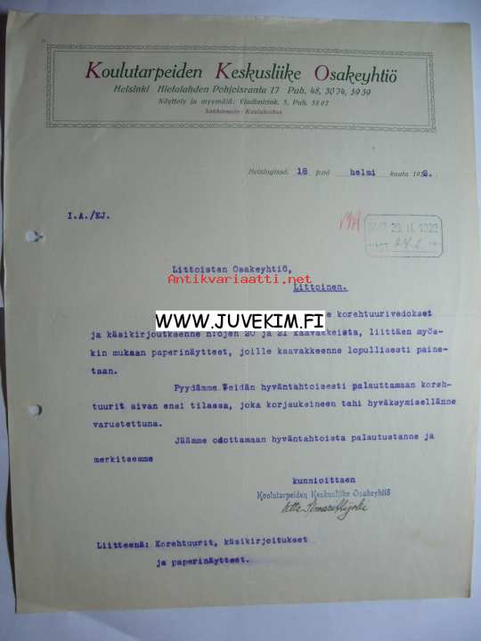 Koulutarpeiden Keskusliike Osakeyhtiö Helsinki 18.2.1923 -asiakirja