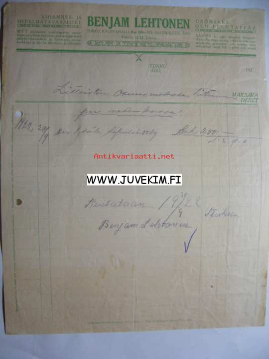 Benjam Lehtonen Turku /Åbo 28.9.1922 -asiakirja