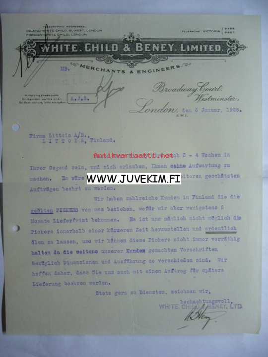 White. Child & Beney. Limited London 6.1.1925 -asiakirja