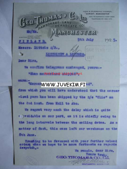 Geo. Thomas & Co Manchester 9.7.1925 -asiakirja