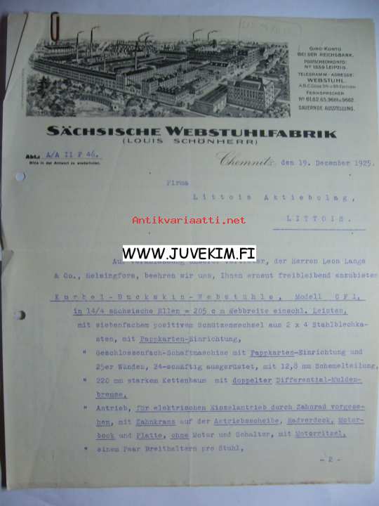 Sächsische Webstuhlfabrik Chemmitz 19.12.1925 -asiakirja