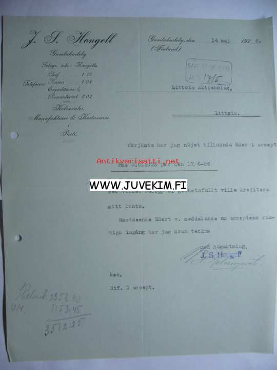 J. I. Hongell Gamlakarleby 14.5.1926 -asiakirja