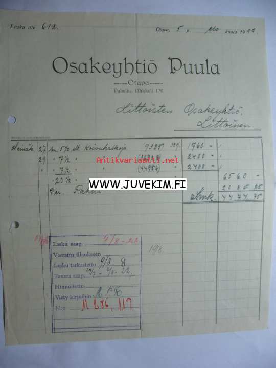 Osakeyhtiö Puula Otava 5.8.1922 -asiakirja