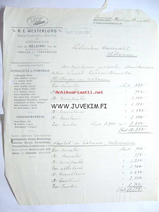 R. E. Westerlund O/Y Turussa 12.7.1923 -asiakirja