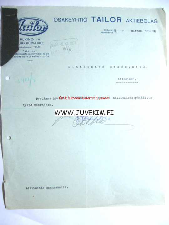 Osakeyhtiö Tailor Aktiebolag Helsinki 8.11.1928 -asiakirja