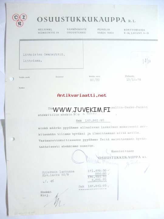 Osuustukkukauppa R.L. Helsinki 15.10.1936 -asiakirja
