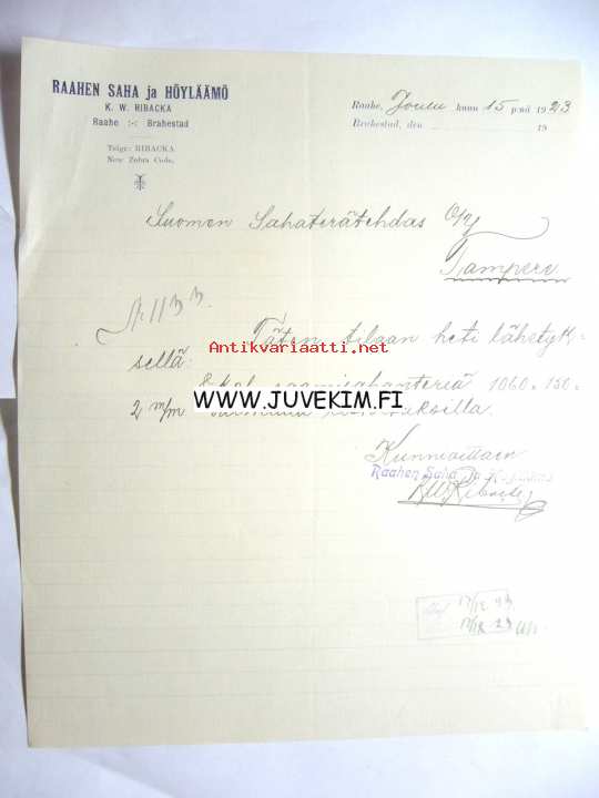Raahen Saha ja Höyläämö Raahe 15.12.1923 -asiakirja