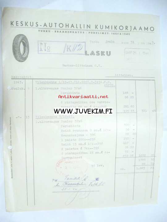 Keskus-Autohallin Kumikorjaamo Turku 31.12.1943 -asiakirja