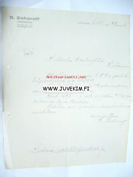 S. Saharoff Joensuu 23.4.1924 -asiakirja