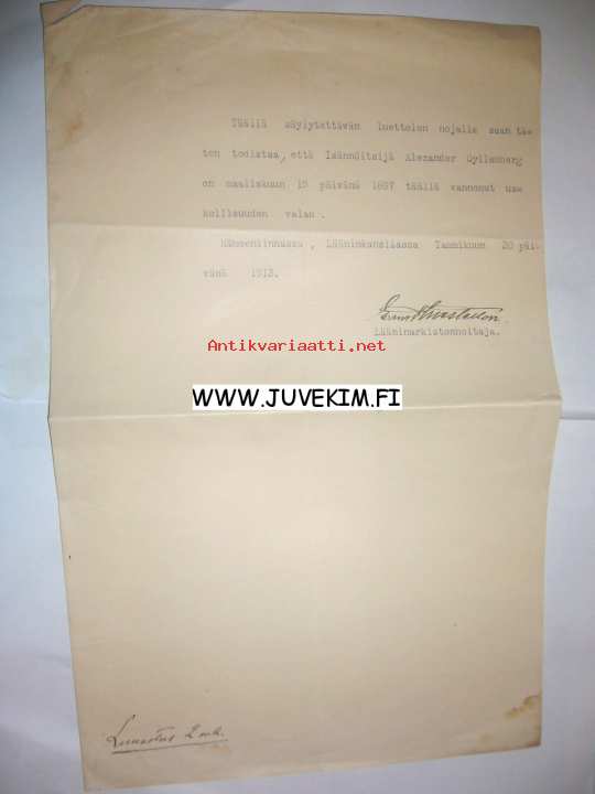 Todistus Hämeenlinna 30.1.1913 -asiakirja