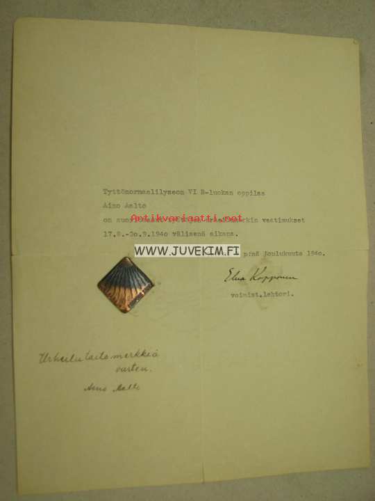 Tyttönormaalilyseon (Helsinki) opppilas Aino Aalto...Elna Kopponen -asiakirja