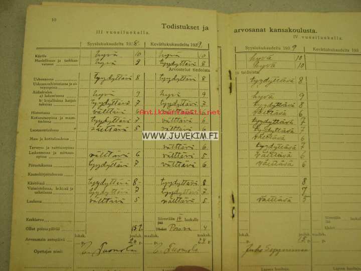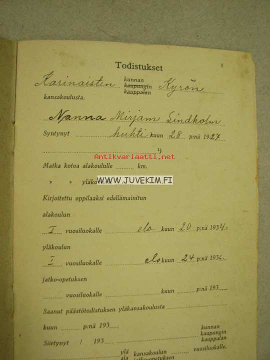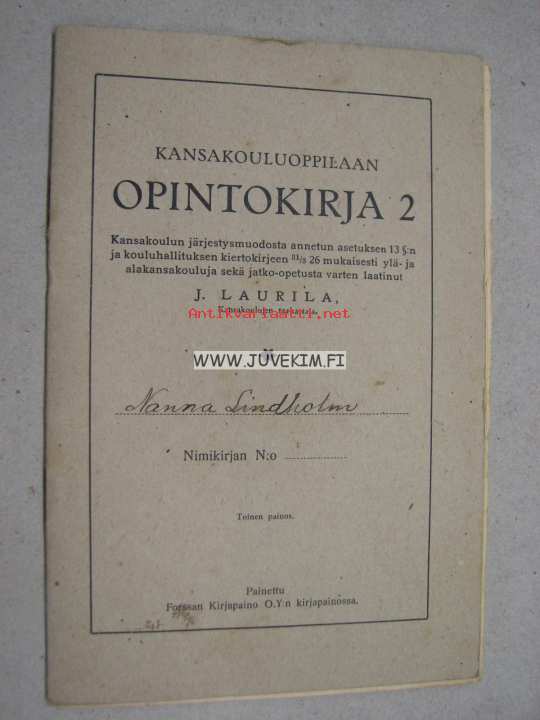 Kansakoulunoppilaan opintokirja Nanna Lindholm Karinainen / Kyrö