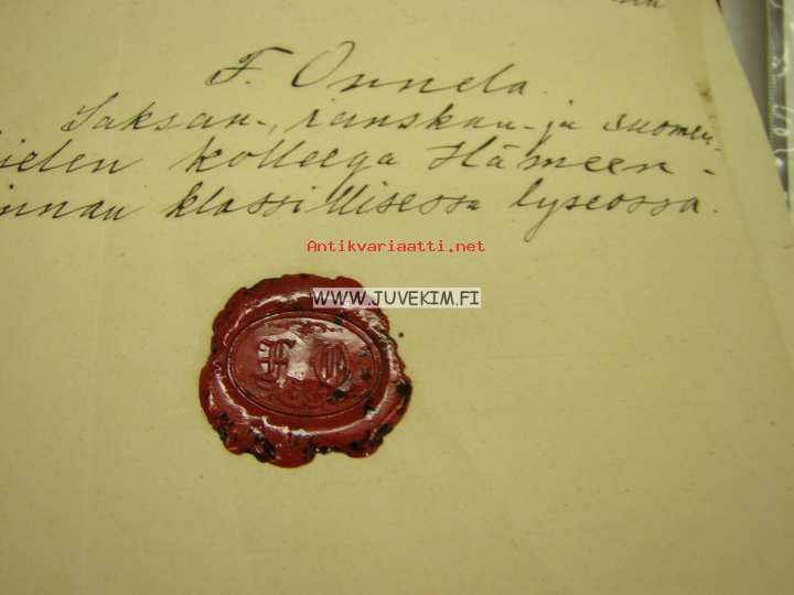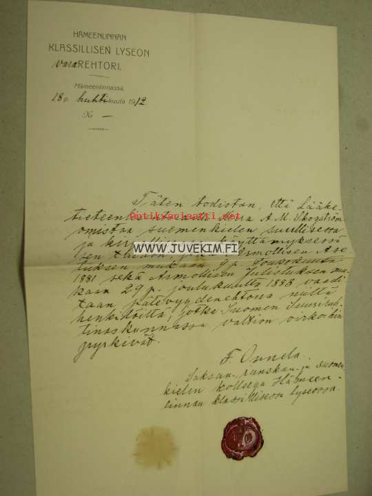 Hämeenlinnan Klassinen Lyseo, todistus kielitaidosta lääket. lis. A.M. Skogström, allekirtjoitus F. Onnela