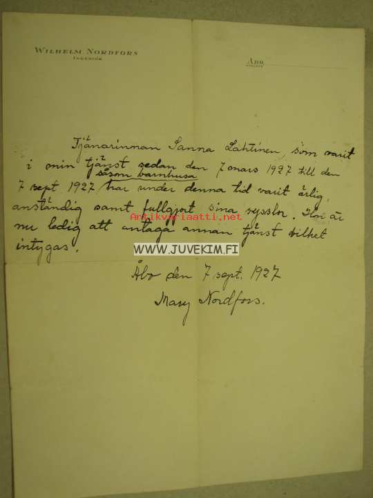 Wilhelm Nordfors / Sanna Lahtinen -palvelustodistus 1927