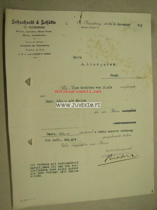 Schuchard & Schütte St. Petersburg 5. / 18. 12.1912 -asiakirja