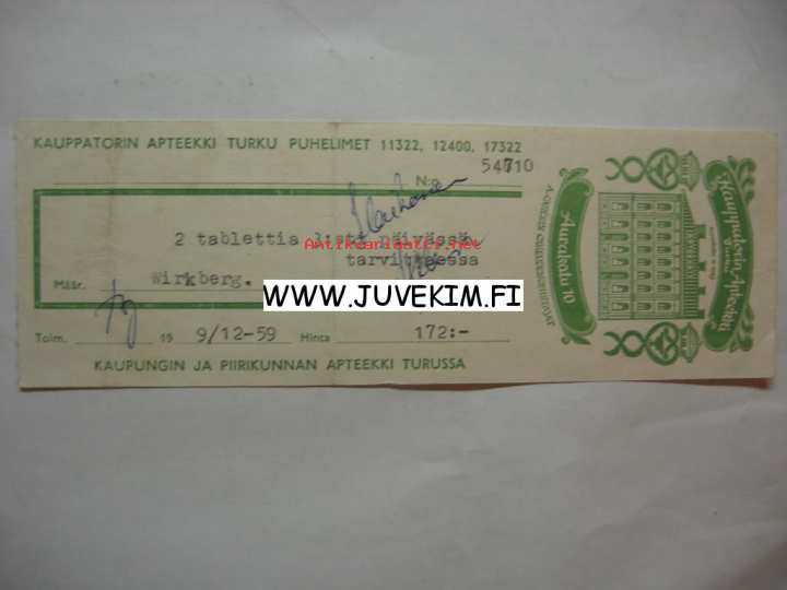 Kauppatorin Apteekki Turku 1959 -signatuuri