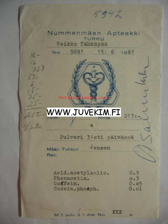 Nummenmäen Apteekki Turku 1961 -signatuuri