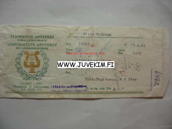 Yliopiston Apteekki Turku 1964 -signatuuri