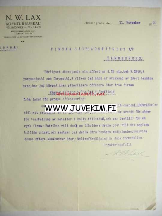 N. W. Lax Agenturbureau Helsingfors/Helsinki 11.11.1920 -asiakirja