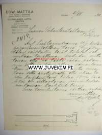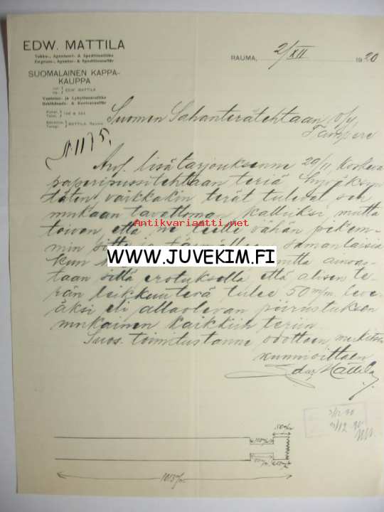 Edw. Mattila Suomalainen Kappakauppa Rauma 2.12.1920 -asiakirja