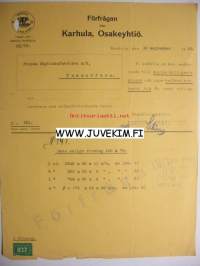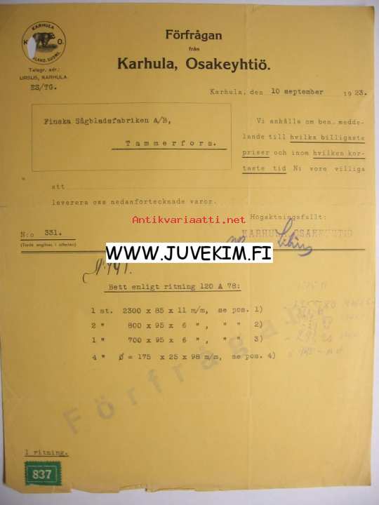 Karhula Osakeyhtiö Karhula 10.9.1923 -asiakirja