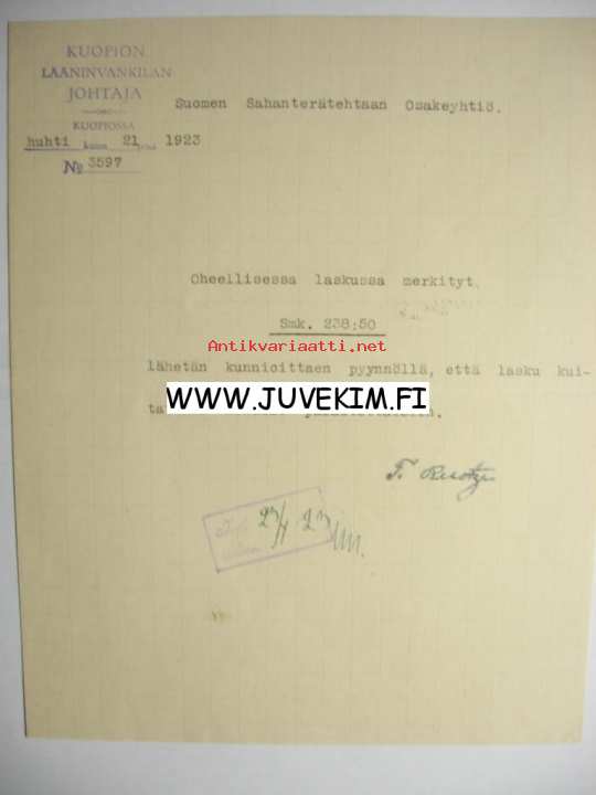 Kuopion Lääninvankilan johtaja Kuopio 21.4.1923 -asiakirja