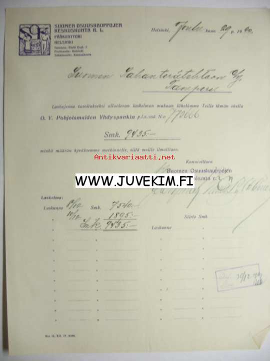 Suomen Osuuskauppojen Keskuskunta R. L. Helsinki 29.12.1920 -asiakirja