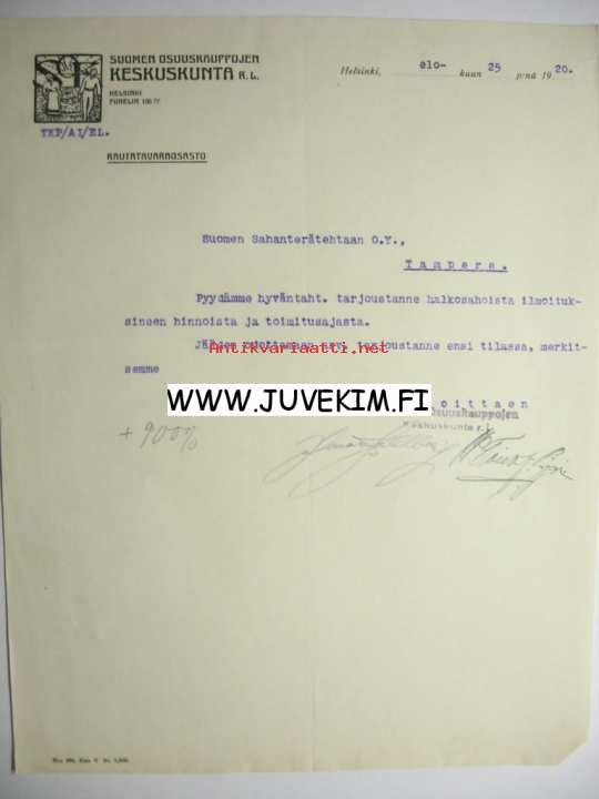 Suomen Osuuskauppojen Keskuskunta R. L. Helsinki 25.8.1920 -asiakirja