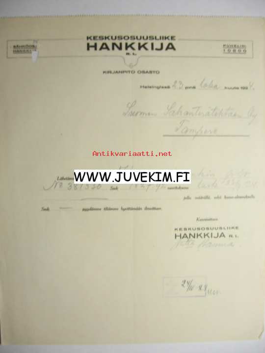Keskusosuusliike Hankkija Helsinki 23.10.1924 -asiakirja