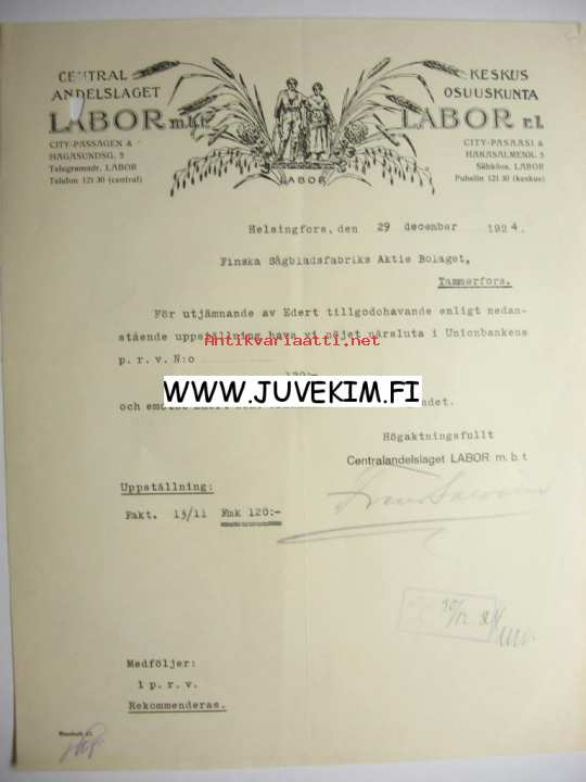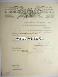Keskus Osuuskunta Labor r. l. Helsingfors/Helsinki 29.12.1924 -asiakirja